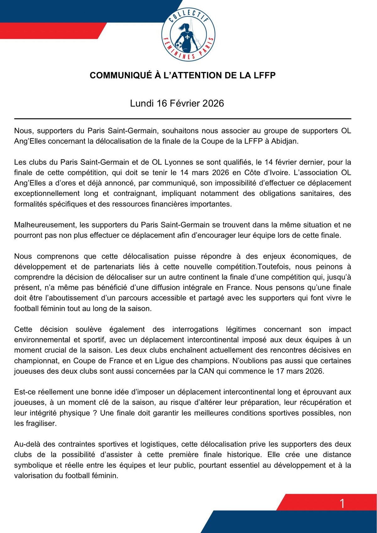 L'historique groupe présent aux quatre coins de l'Europe durant la saison ne digère pas la délocalisation, qui est un non-sens surtout au vu du calendrier qui se profile pour les Fenottes mais aussi un coût financier avec pas moins de 20h de vol aller-retour pour ces inconditionnels. À cela s'ajoute "une obligation de se faire vacciner contre la fièvre jaune". Si OL Ang'Elles comprend que "l'organisation de cette nouvelle compétition nécessite des ressources financières", le groupe s'oppose à ce que le chemin pris soit le même que chez les garçons avec des finales disputées "loin de l'ancrage local".