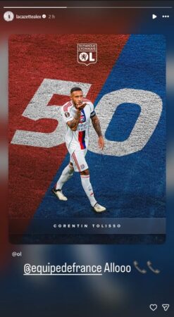Dans un post sur Instagram, l'ex-Rhodanien a partagé les félicitations de l'OL pour la 50e réalisation du natif de Tarare, en identifiant le compte de l'équipe de France. Le tout suivi d'un "allô" sonnant comme un rappel. La Ligue 1 également s'est fendue d'un tweet similaire ce mardi sur le but du milieu de terrain. Le staff français l'a-t-il reçu ? Sans doute, mais cela ne garantit pas pour autant une 29e capes à Corentin Tolisso.