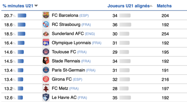 Malgré des résultats en deçà ces dernières saisons, l’OL arrive toujours à sortir des joueurs de son académie. Sur les cinq dernières années, le club lyonnais est l’un de ceux qui accordent le plus de confiance aux éléments de moins de 21 ans en Europe.