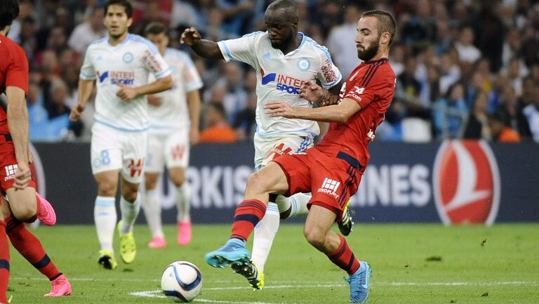 Lyon’s Spanish midfielder Sergi Darder (R) vies with Marseille’s French midfielder Lassana Diarra during the French L1 football match Marseille (OM) vs Lyon (OL) on September 20, 2015 at Velodrome Stadium in Marseille, southern France. AFP PHOTO / FRANCK PENNANT